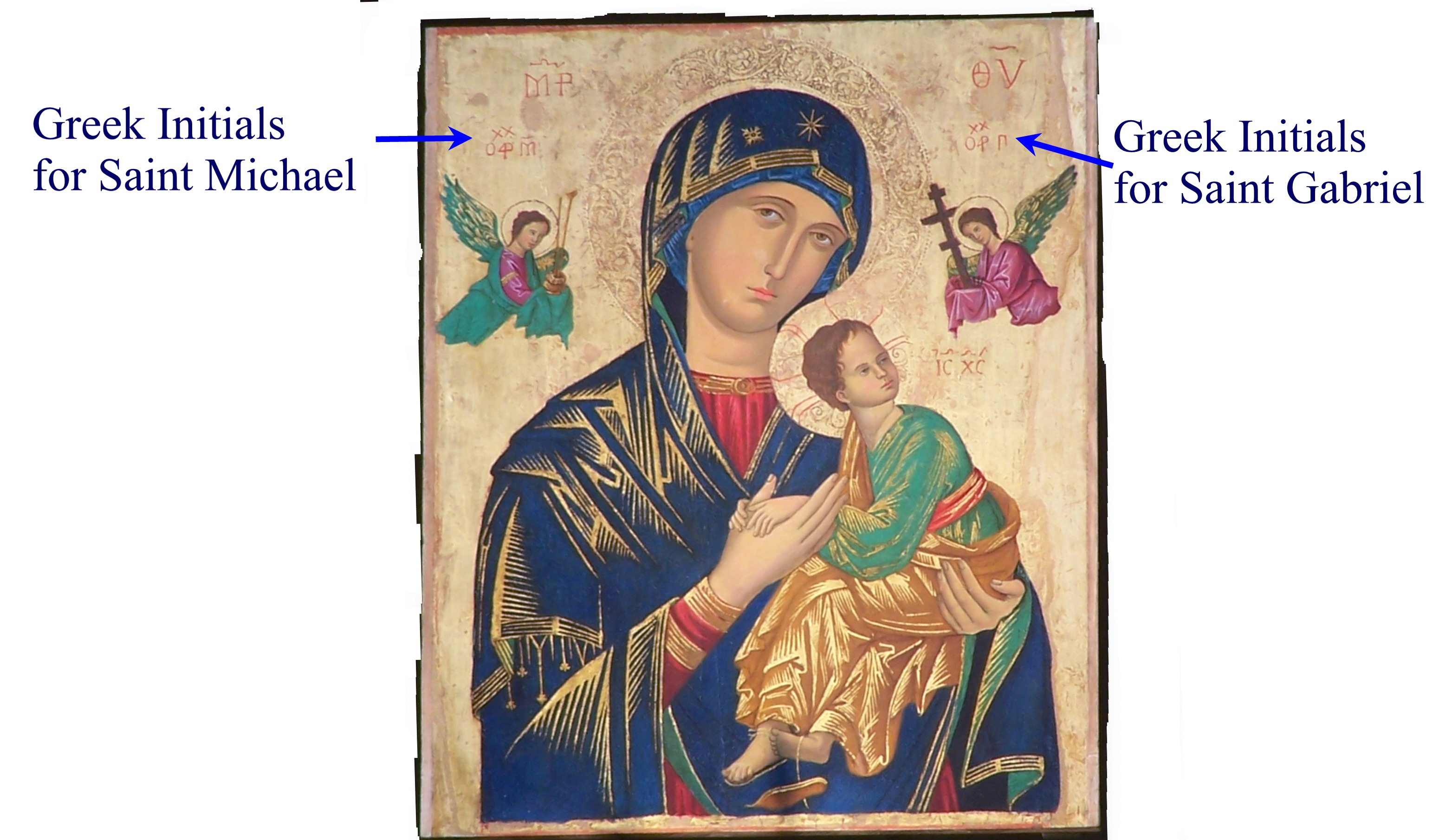While sitting quietly, I asked Mary who the two angels in the picture were. I heard a woman's voice in my head lovingly and clearly say, "St. Michael and St. Gabriel." Six months later, I came into church and saw a document explaining the painting. If you look closely, there is Greek lettering above each angel, which translated means, "Michael" and "Gabriel." I don't read Greek! this was a confirming miracle that I was in the right place.